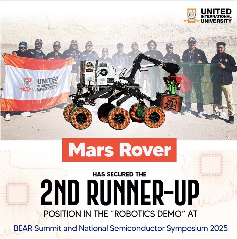 At the Bear Summit 2025, the UIU Mars Rover Team (UMRT) achieved remarkable success, securing the 2nd Runner Up position. United International University (UIU) proudly showcased its cutting-edge innovation at the BEAR Summit and National Semiconductor Symposium 2025, where the UIU Mars Rover Team earned the title of 2nd Runners-Up in the Robotics Demonstration segment. Their rover, designed and built by students of UIU’s robotics research group, stood out for its advanced engineering, problem-solving capabilities, and real-world applicability in planetary exploration. This achievement highlights UIU’s growing contribution to robotics and deep-tech research in Bangladesh, inspiring young engineers to push the boundaries of technology and innovation.